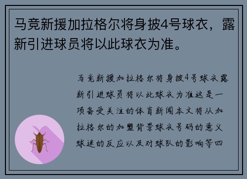 马竞新援加拉格尔将身披4号球衣,露新引进球员将以此球衣为准。这是一项备受关注的体育新闻,本文将从加拉格尔的加盟背景、球衣号码的意义、球迷的反应以及对球队的影响等四个方面进行详细解读。首先将介绍加拉格尔...