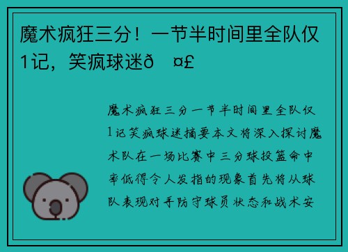 魔术疯狂三分!一节半时间里全队仅1记,笑疯球迷🤣摘要:本文将深入探讨魔术队在一场比赛中三分球投篮命中率低得令人发指的现象。首先,将从球队表现、对手防守、球员状态和战术安排四个方面进行详细阐述。在正文内...
